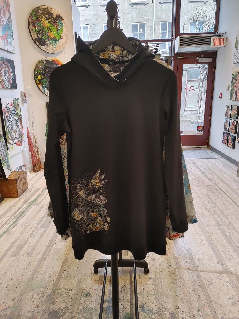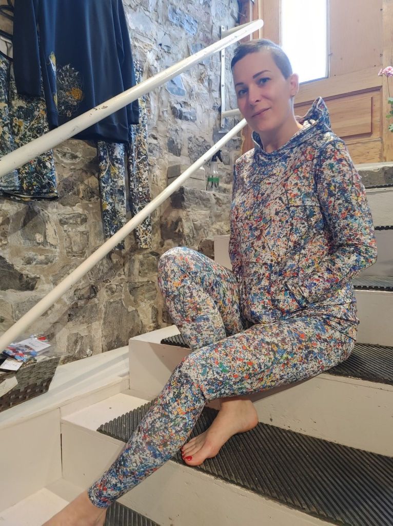 Depuis longtemps Esther Garneau désirait voir ses œuvres prendre forme sur des vêtements d’où l’idée de collaborer avec Carol-Anne Pelchat. Une collection de 50 pièces uniques à impression textile a donc vue le jour. C’est ainsi que des leggings haut en couleur, de jolies robes, tuniques, tuques, mitaines, foulards, pantalons et masques de protection feront le bonheur des consommateurs de mode locale et éthique.