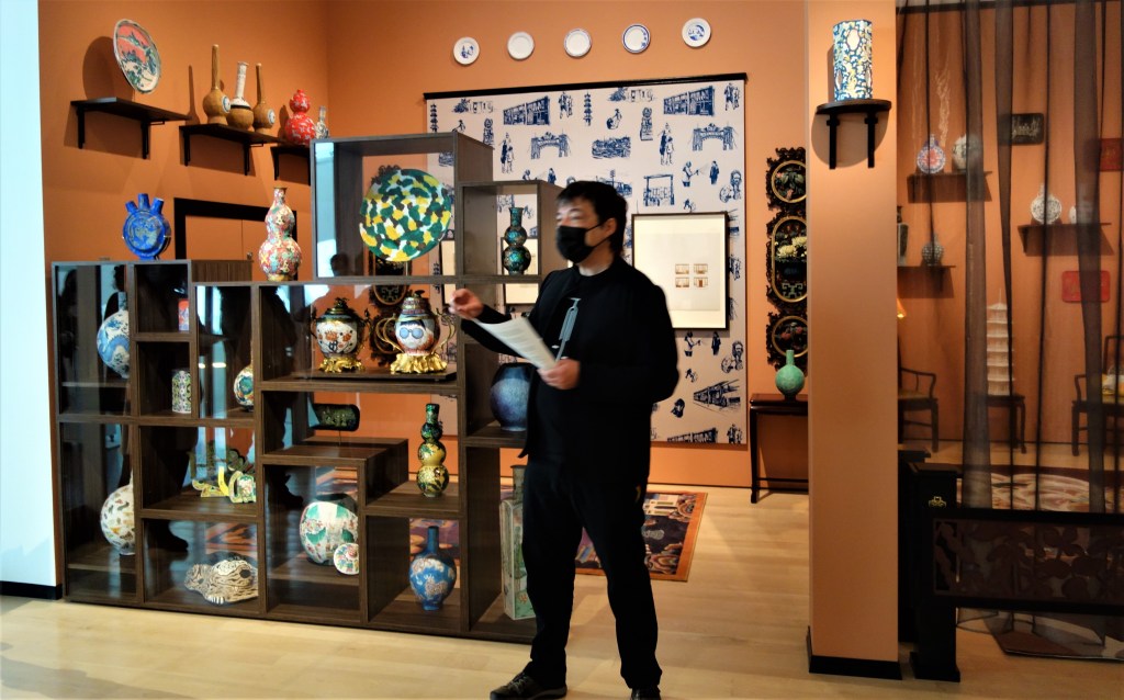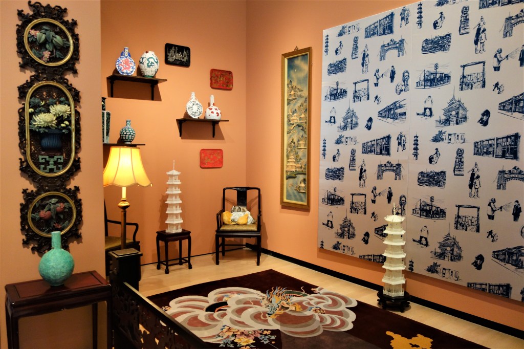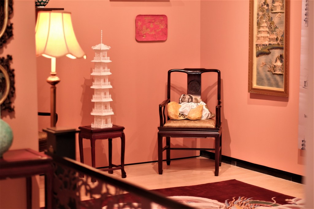 Par la suite, cette visite nous mène à la superbe installation Le Salon chinois – White Gold oeuvre de l’artiste Montréalaise Karen Tam. Elle est impressionnante à regarder et elle est d’ailleurs mon coup de coeur de l’exposition. Installation grandiose, elle démontre l’engouement pour nous occidentaux envers la porcelaine chinoise communément appeler l’or blanc.