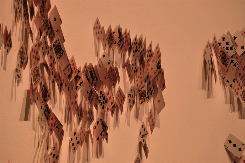 Autre oeuvre remarquable est celle de l’artiste américain Glenn Kaino. Untitled (Ricky Jac) Cartes à jouer, 2010. Ici, Kaino joue avec les diverses contradictions poétiques dans le but de réconcilier des idées qui peuvent sembler conflictuelles, voire opposées ou dichotomiques. Il reforme ainsi des différentes composantes de la vie réelle tout en combinant des éléments disparates afin de construire des pièces conceptuellement fortes.