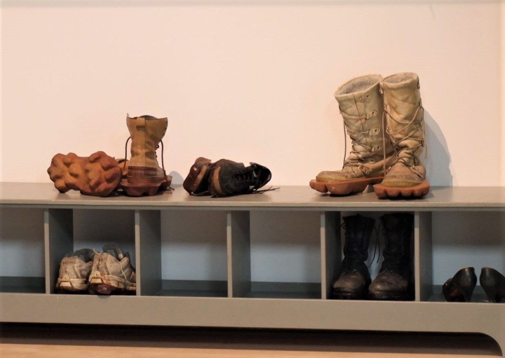 L’oeuvre intitulée Outliers (Trace), 2012, est le travail de Maskull Lasserre. Et cette oeuvre m’a particulièrement intriguée en raison de cette relation entre l’accessoire mode, la chaussure, et son utilité.