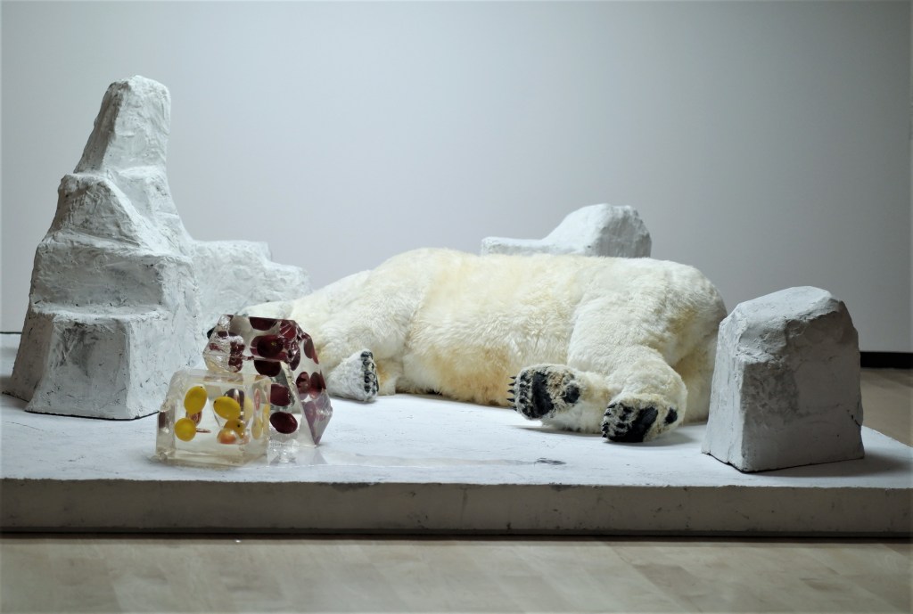 Cette triste sculpture démontre un animal plutôt amorphe qui se résigne à perdre ses points de repère naturels et sa liberté que lui impose son nouvel abri contraignant. L’artiste dénonce, de cette façon, cette victime de l’aliénation que l’on inflige aux espèces animales que l’on exploite pour les domestiquer ou se divertir. Ici, l’ours blanc démontre à peine quelques signes vitaux qui sont techniquement bien réussis visuellement par l’ajout notamment d’un moteur à l’intérieur de son ventre simulant ainsi sa respiration.