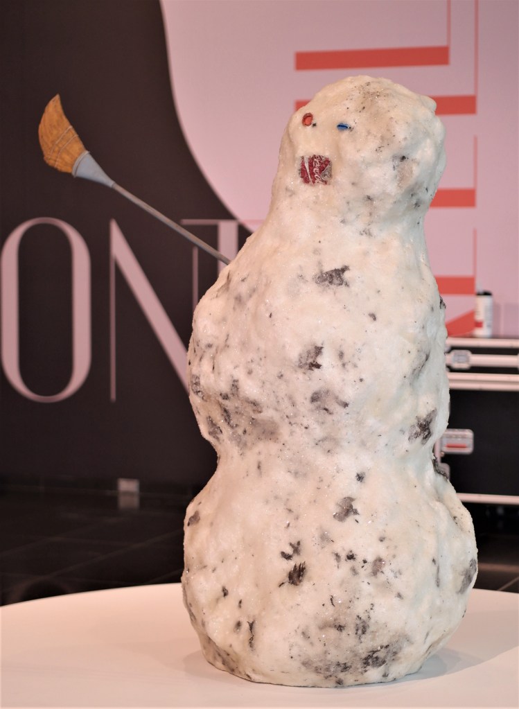 L’oeuvre de l’artiste américain Tony Tasset Snowman with Coke Can Mouth and Broom est la première visible à l’entrée de l’exposition et celle-ci analyse le rêve américain tel qu’on le connaît ainsi que ses nombreux mirages. L’artiste lors de son travail récupère des images emblématiques provenant des différents médias et réalise d’incroyables caricatures. Cette oeuvre ludique est une imitation de la forme iconique de l’art populaire bien connue : le bonhomme de neige.