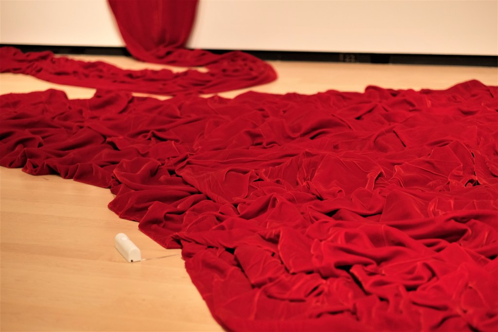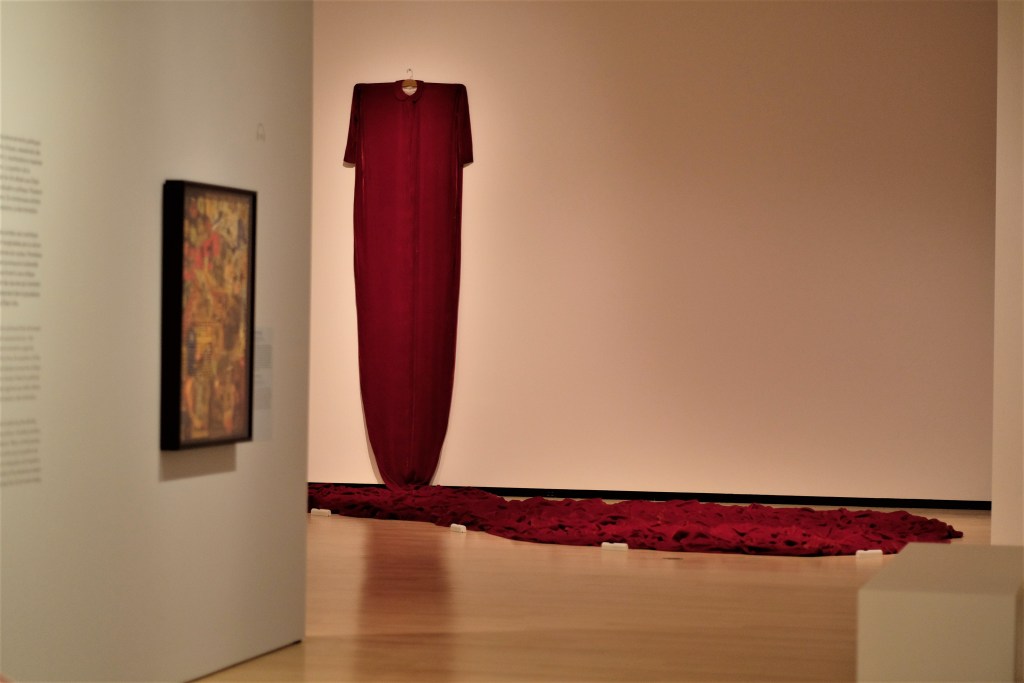 Cette robe rouge est flanquée au mur du musée tel un tableau et l’immense cascade de velours rouge vif qui s’étend au sol symbolise pour l’artiste une flaque, voir des composantes de sa vie plus intime évoquant probablement les périodes féminines.