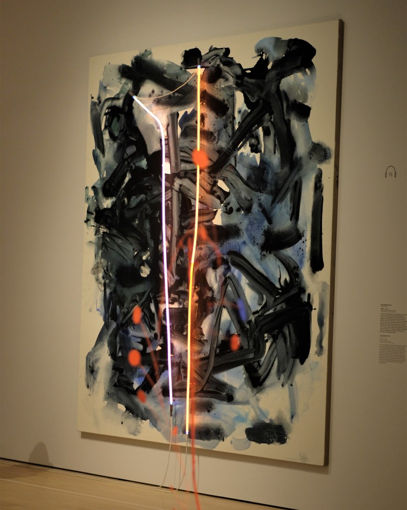 Ici, Mary Weatherford s’inspire de l’ambiance des ports new-yorkais pour évoquer le motif de l’eau. Elle ajoute par la suite des néons de couleurs contrastantes afin de produire une lumière vive procurant ainsi intensité et force au dessin.