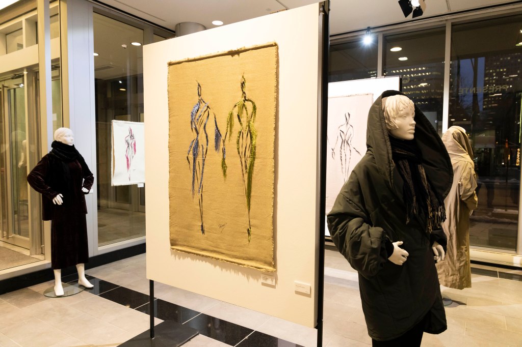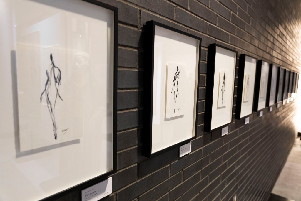 Parmi les œuvres présentées, l’on retrouve de superbes peintures et broderies sur toile, de magnifiques sculptures de bustiers, des esquisses sur papiers texturés et bien sûr les modèles qui ont rendu les femmes telles qu’Andrée Lachapelle ou Collette Chicoine, ses muses, si élégantes.