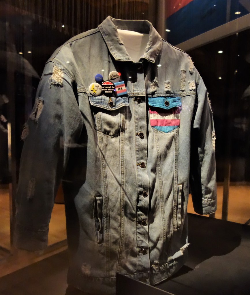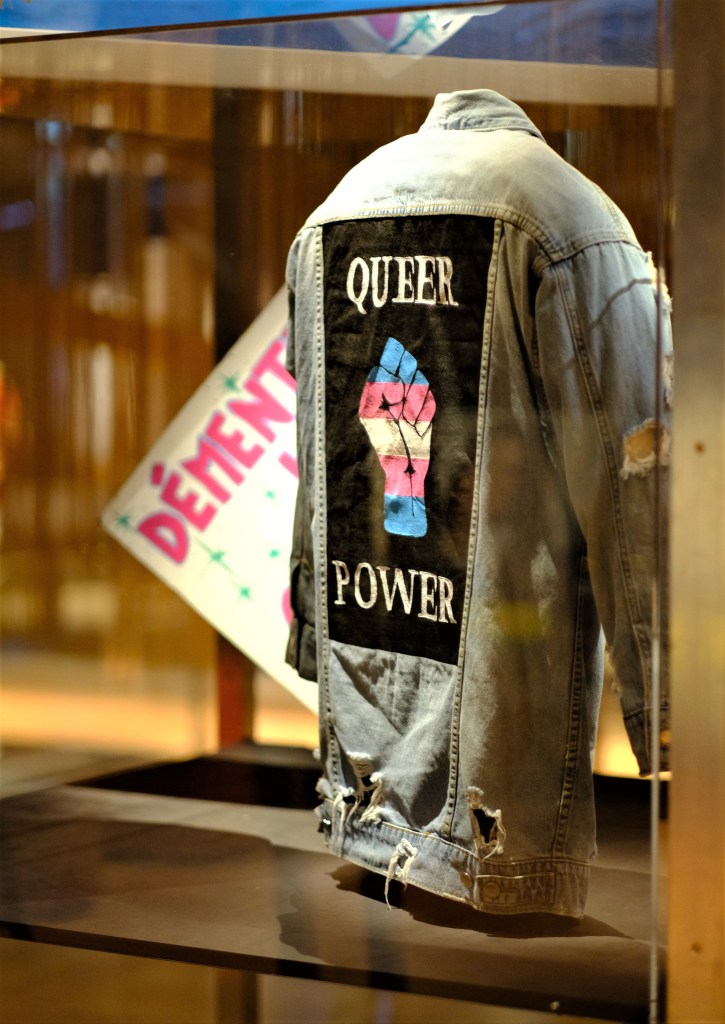 Cette veste en denim appartenant à Marie-Philippe Phillie Drouin où il est inscrit Queer Power symbolise l’autodérmination et la libération. Ce terme queer d’origine anglo-saxonne réfère à toute idée, pratique, personne ou identité qui va l’encontre des normes établissant le modèle social cishétéronormatif.