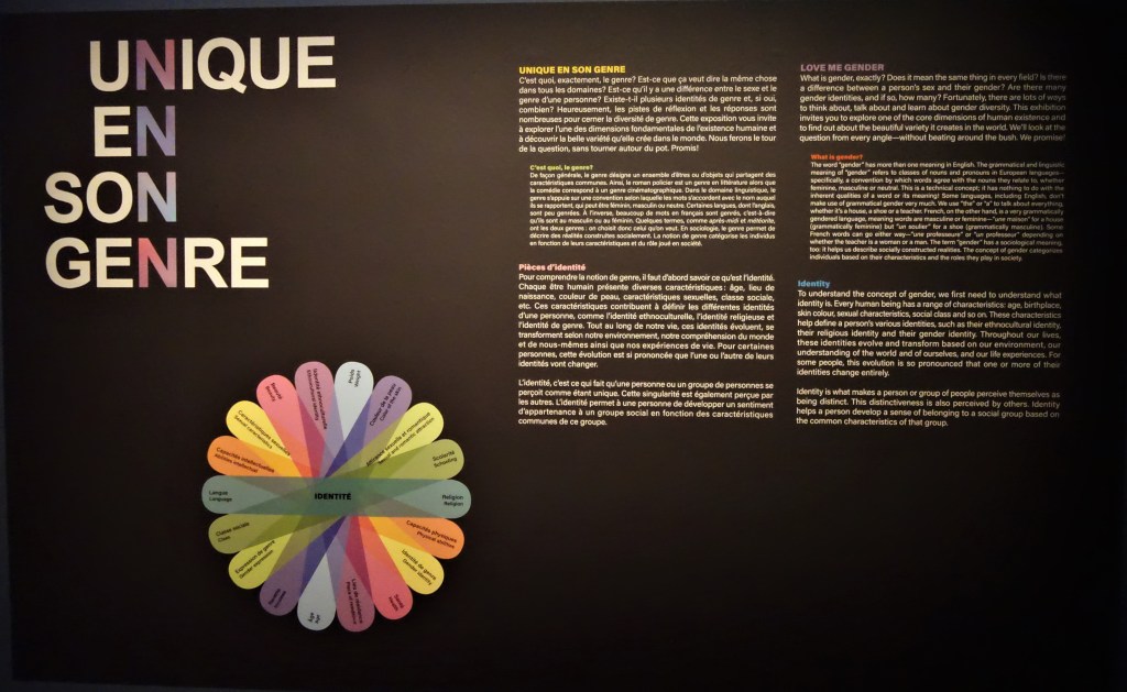 Cette notion de genre, présentée lors de l’exposition, se veut une prise de conscience collective. Partant du principe que tous les êtres humains ont un sexe, une identité de genre et une expression qui lui est propre, dans notre vie de tous les jours, le concept de binarité, l’identité homme, femme, permet une prise de conscience de la dualité et de l’exclusivité des univers féminin et masculin.