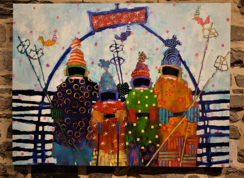 Un hommage à l’hiver québécois est également rendu par de superbes tableaux évoquant la saison de ski témoignant ainsi de la richesse de nos saisons. Ludiques et colorés à la fois, les personnages de l’artiste nous transportent dans un univers familial de joie.