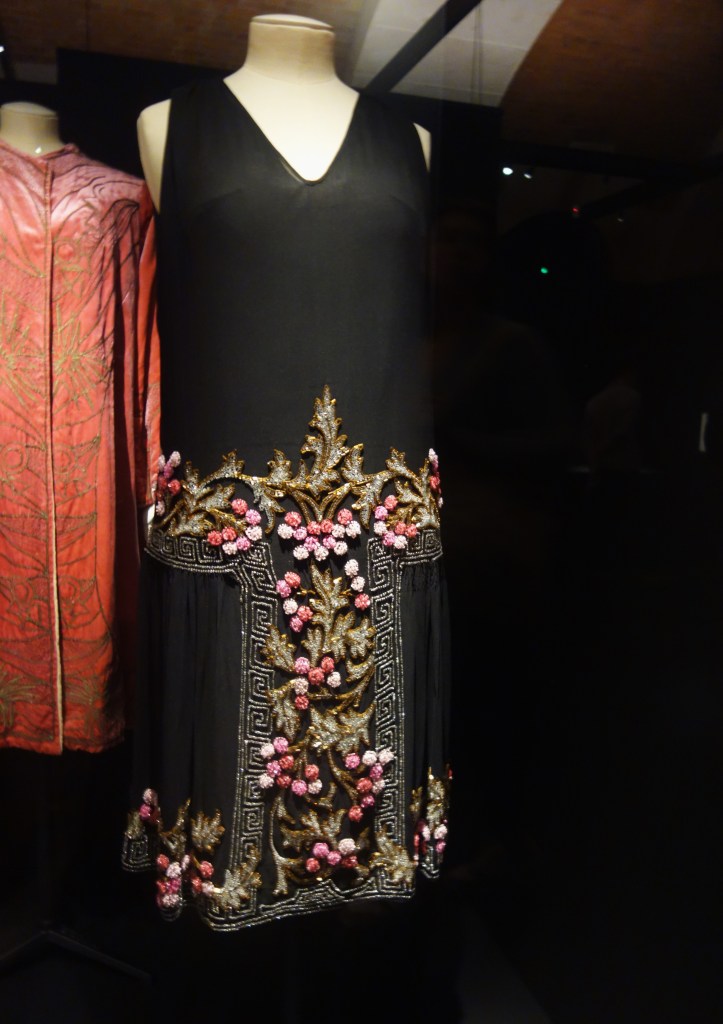 La guerre maintenant terminée, les femmes s’émancipent. Elles sortent, fument, prennent un verre et dansent au rythme du charleston, du fox-trot et du black-bottom. Les corps en mouvement se dévoilent, les robes raccourcissent, la silhouette est droite et l’allure féminine est androgyne. Les tenues de jour sont sobres et elles sont luxuriantes pour le soir laissant ainsi paraître de magnifiques broderies.