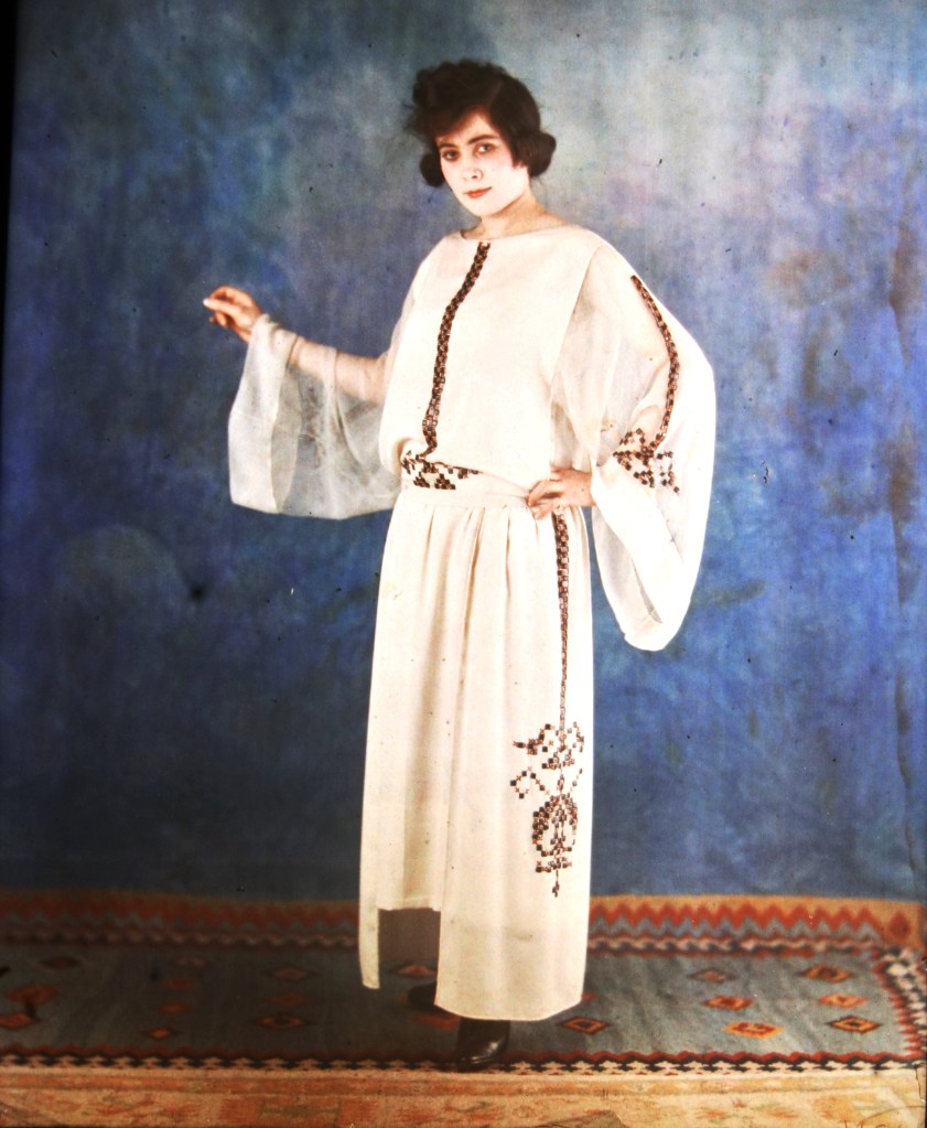 Les plaques autochromes démontrent bien toute la fantaisie et l’originalité des imprimés à la mode. Les modèles fabriqués en crêpe de soie ou en voiles de coton arborant de larges motifs se démarquent alors par leurs modernismes et leurs vifs coloris.