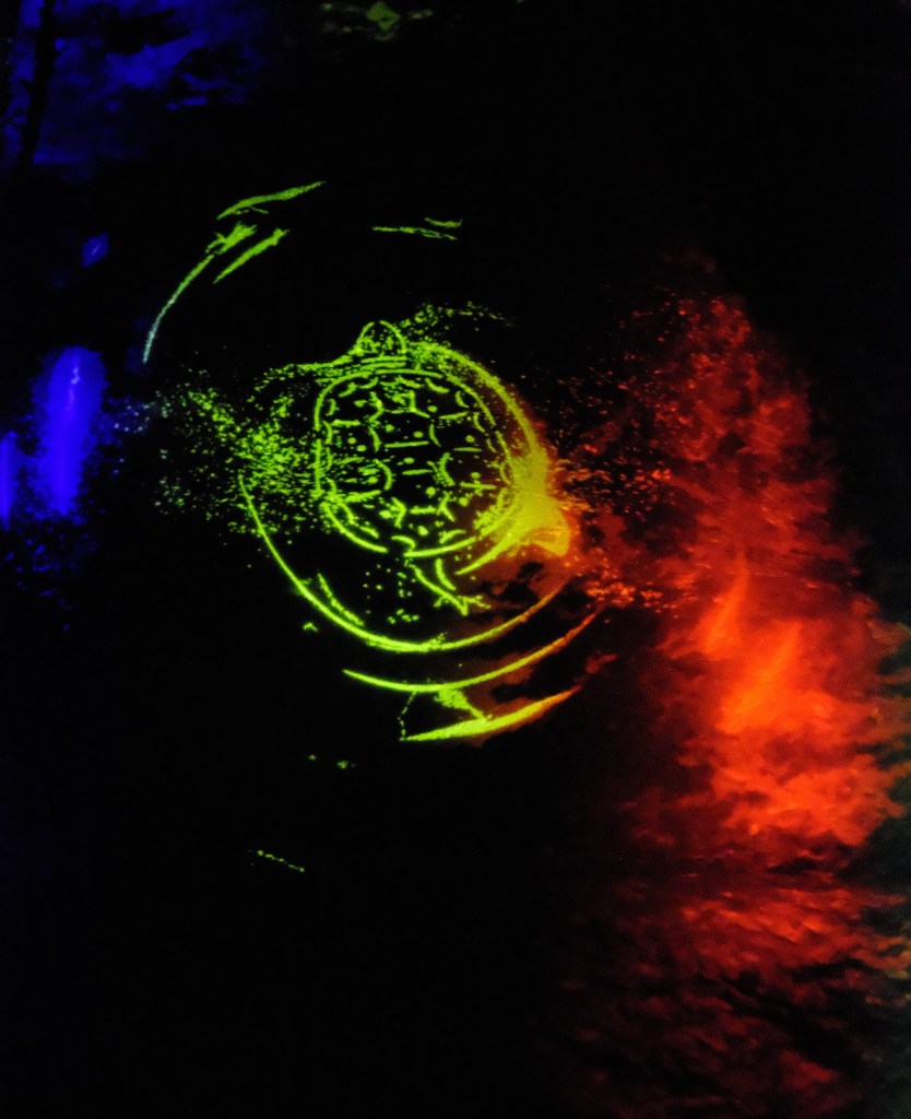 C’est ainsi qu’un merveilleux voyage onirique commence dans cette forêt enchantée à l’intérieur d’un grand cercle lumineux, cercle qui symbolise la conception circulaire du monde qui nous entoure. Ce voyage se poursuit à dos de tortue et par la suite, c’est autour de l’âtre d’une longue maison imaginaire de nous accueillir. Ensuite, l’on circule à travers un village lumineux bien mouvementé, puis nous sommes invités à découvrir la station Notre monde. En poursuivant notre chemin, nous apercevons sous nos yeux, et c’est impressionnant, les ancêtres hurons-wendat se dresser devant nous. La visite du parcours se termine en grand par la découverte des étoiles lumineuses.