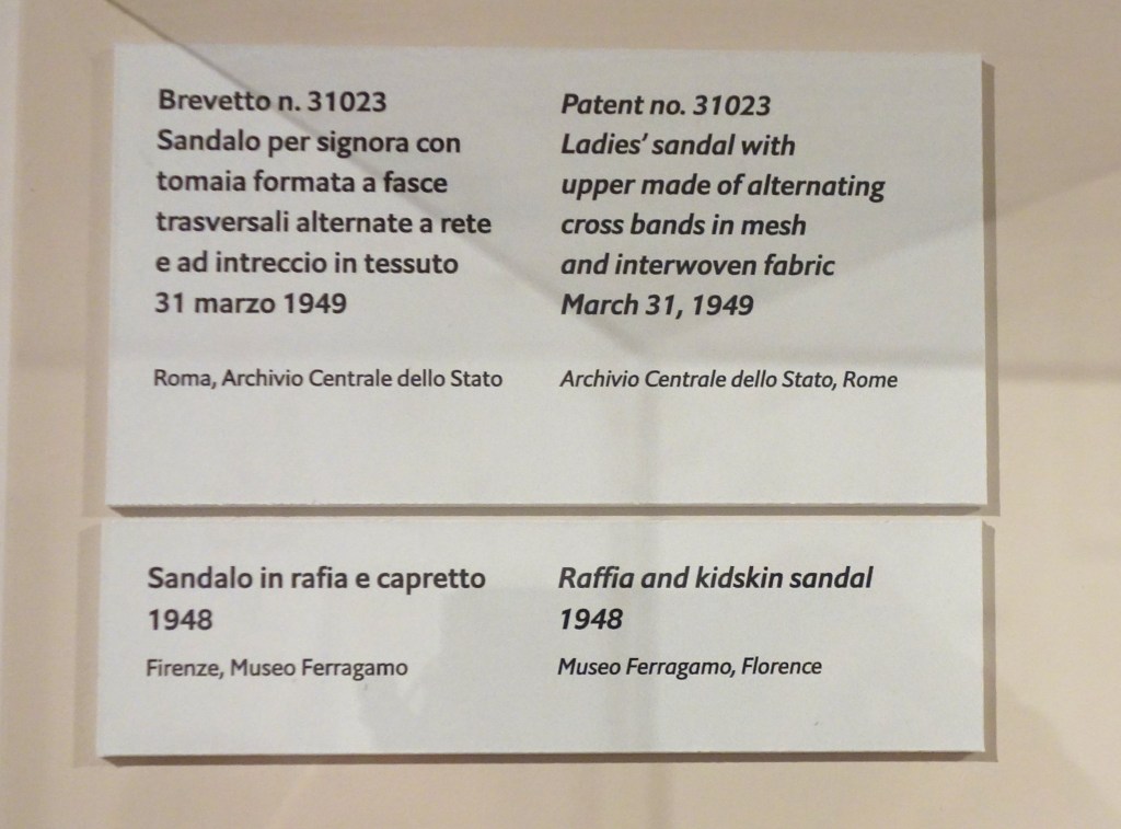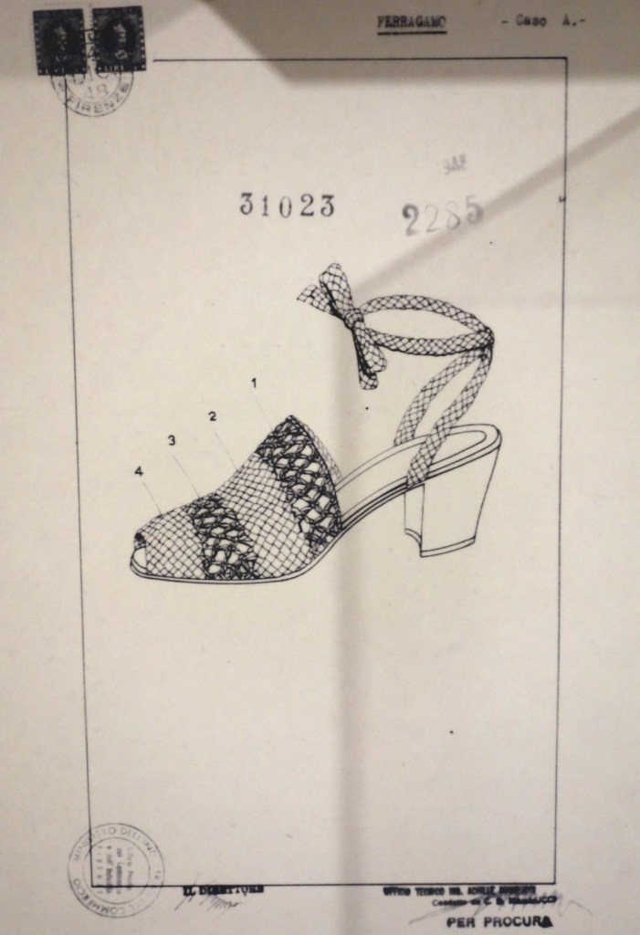 Ferragamo conçoit le design de la chaussure telle que le fait un designer industriel. Autant, il dessine des modèles fabriqués exclusivement à la main, autant il pense à la fabrication en série et en ce sens, il a produit 368 brevets enregistrés. Ses dessins techniques démontrent également d’intéressantes vues de perspective axonométrique de la chaussure.