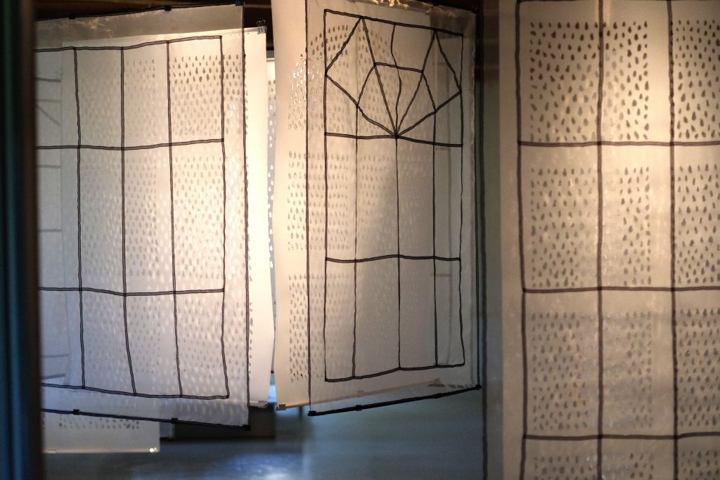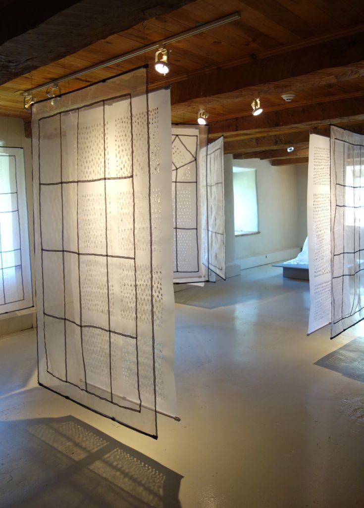 Vessna Perunovich est née et a grandi en ex-Yougosiavie et elle s’intéresse en particulier aux notions de foyer, d’exil et de frontières. Pour l’artiste, la douce lumière de l’aube qui perce l’obscurité reflète l’essence même de l’expérience humaine. Celle-ci symbolise un nouveau départ, elle est porteuse d’une certaine résilience. Les perforations réalisées dans les panneaux de Mylar sont autant de larmes, de vies perdues, de mondes brisés. Vues de l’intérieur de l’espace domestique, de la maison qui offre une forme de protection, ces petites ouvertures peuvent aussi permettre à la lumière d’entrer pour accéder à des souvenirs plus heureux. (2)