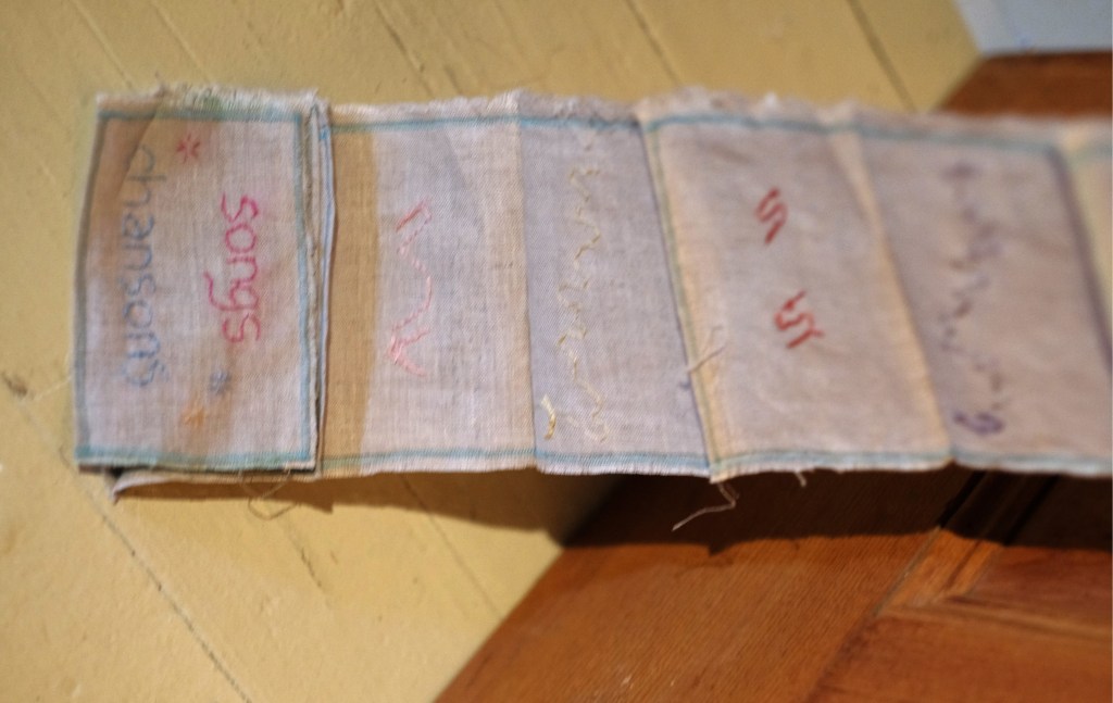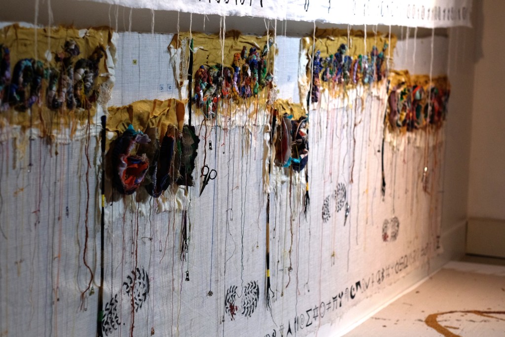 Pour Yentele, artiste française, la rose du matin est porteuse de vie. Comme des gouttes d’eau qui se déposent sur tous les objets qui se trouvent dans le paysage. L’artiste applique alors l’aquarelle en fines couches translucides sur le lin ancien. La toile se teinte ainsi de nuances colorées qui naissent avec le lever du jour. L’œuvre s’étale de toute sa largeur afin de former une ligne d’horizon décorée de petits éléments brodés. Et, chacune de ces cellules est porteuse de renouveau, d’espoir et d’une vie nouvelle. (1)