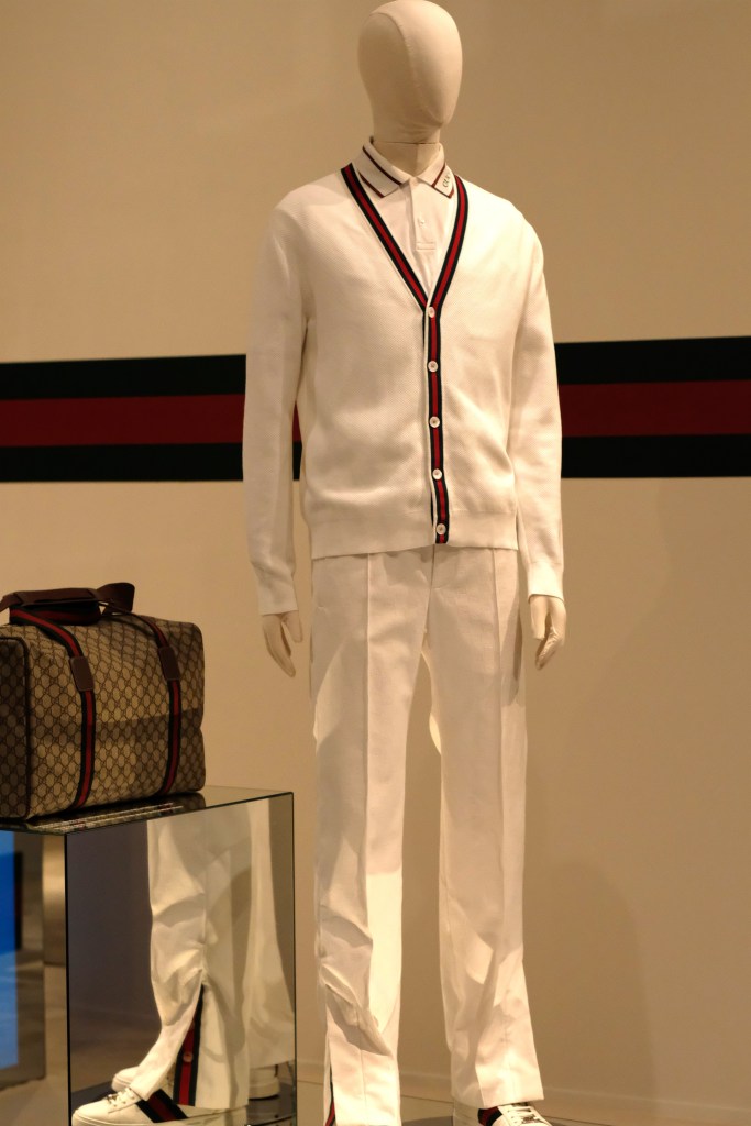Cotton cardigan, piquet polo shirt and GG jacquard pants, Gucci Ace leather sneakers, Sabato De Sarno, Gucci Tennis collection, 2024.