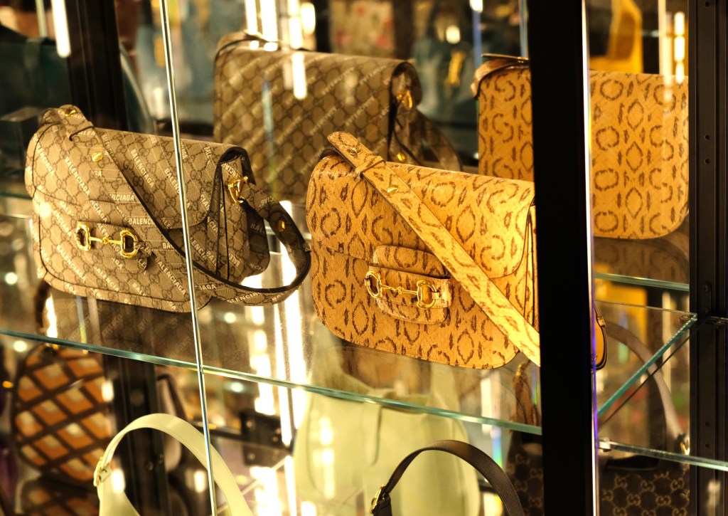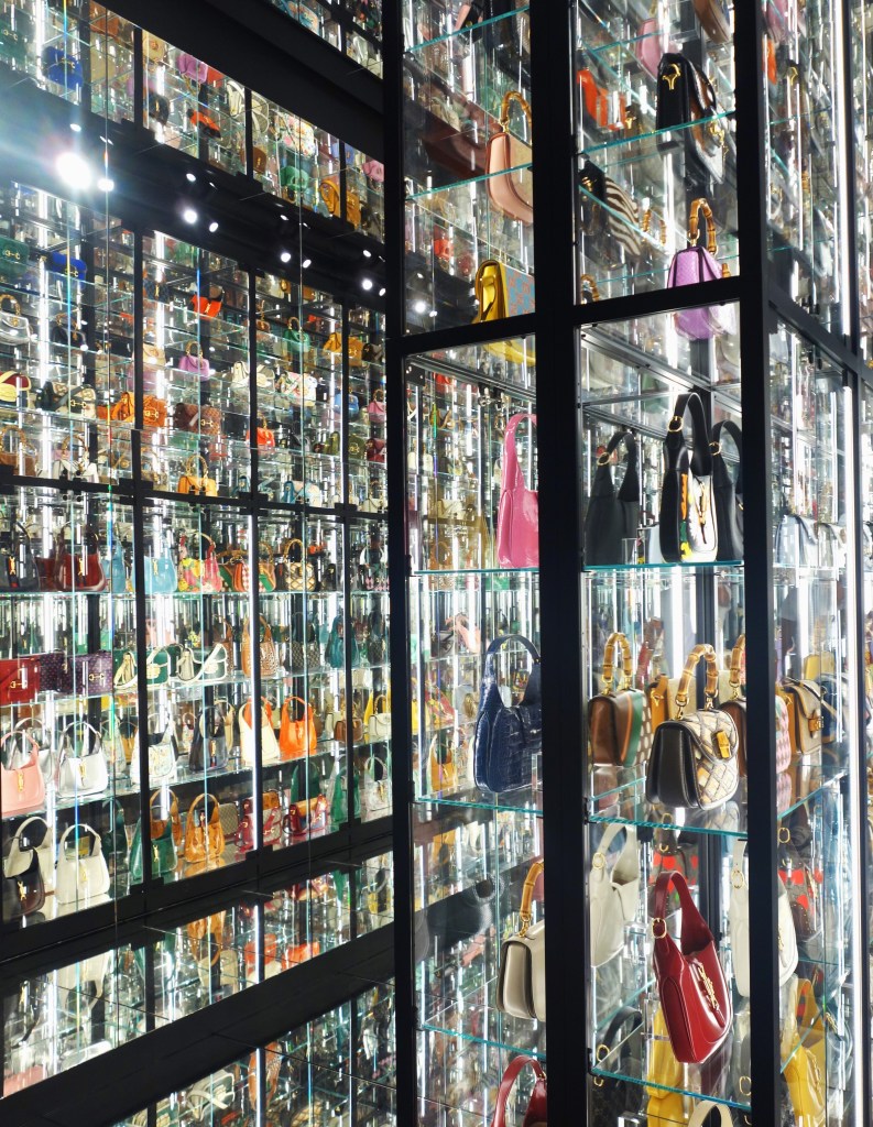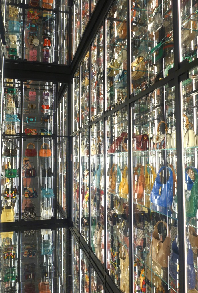La visite du Gucci Garden se termine par la découverte d’une incroyable salle muséale dont le plancher et les espaces de rangement sont à la fois vitrés et fabriqués de miroir. Salle où sont exposés, dans des cubicules, une multitude de sacs à main et où l’on est tout simplement renversé d’y circuler.