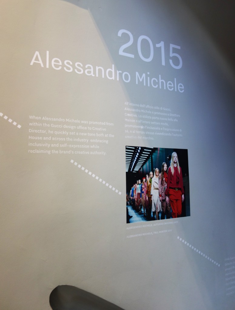 La visite du musée se poursuit avec la découverte d’une des salles qui est nouvellement aménagée et qui est dédiée à des modèles soigneusement sélectionnés par les directeurs de la création passés et présents de la maison telle que Dawn Mello, Tom Ford, Frida Giannini, Alessandro Michele et depuis 2023 Sabato de Sarno. Cet espace muséal permet ainsi d’offrir une vision unique des agencements des esprits créatifs qui sont à l’origine des différentes pièces dessinées au fil du temps.