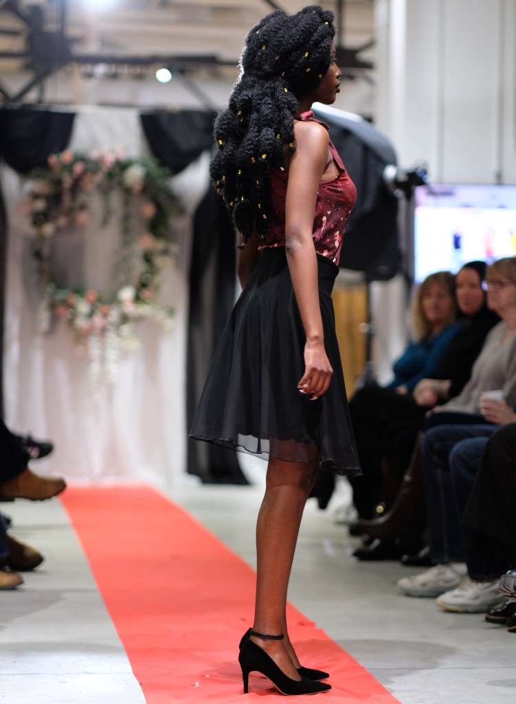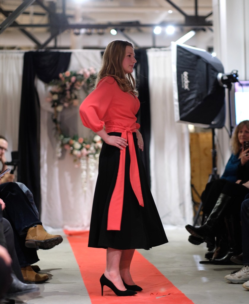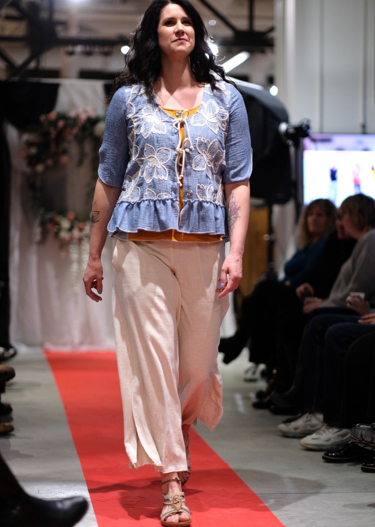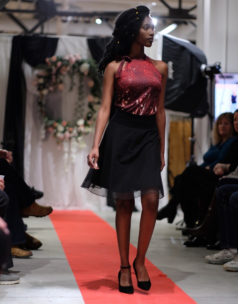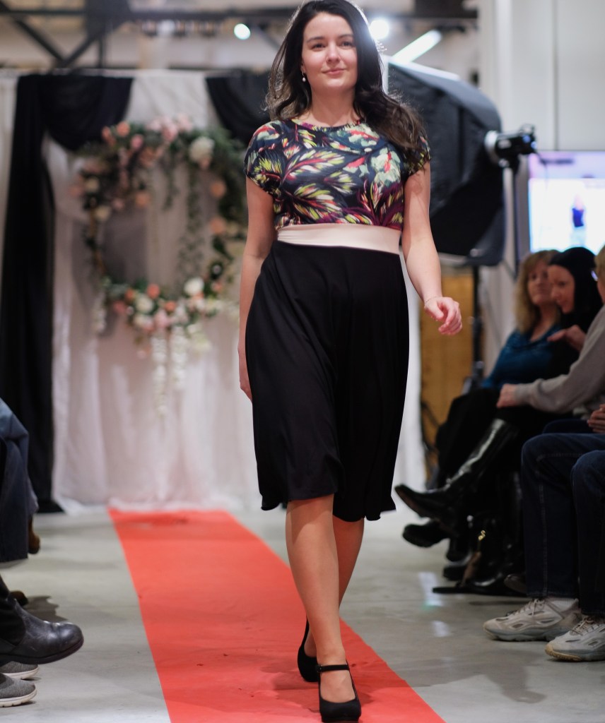 Léonie L’Heureux Coulombe, créatrice de la marque Infime, a présenté ce soir-là de remarquables modèles aux jolis motifs floraux très féminins. Modèles pouvant convenir à la femme de taille régulière aussi bien que celle portant une plus petite taille. Et, cette démarche créative est à souligner en regard de la diversité corporelle, bravo !