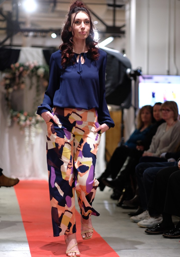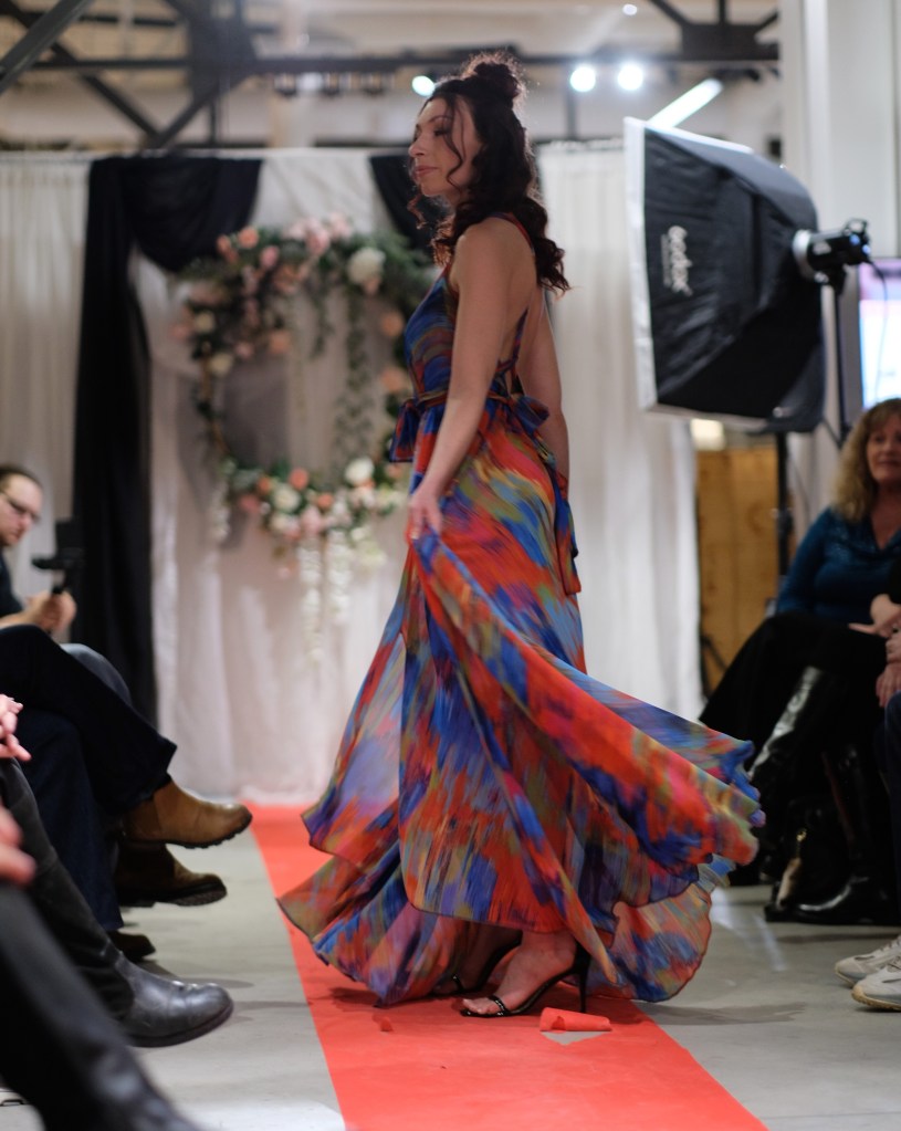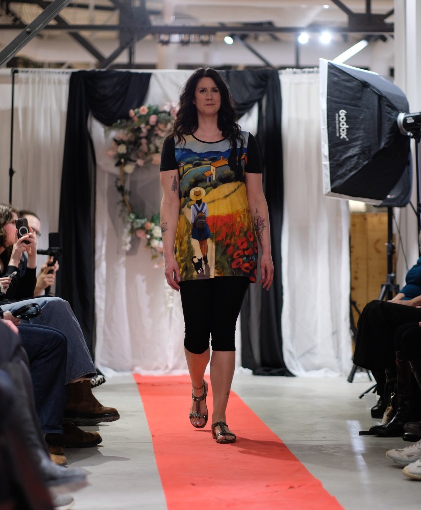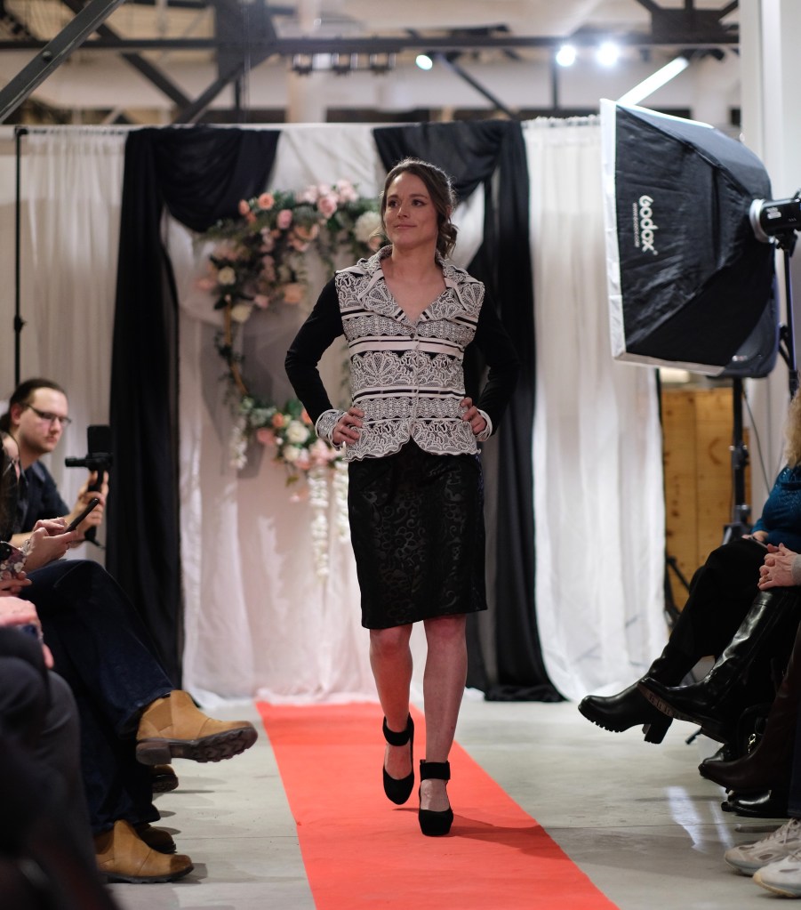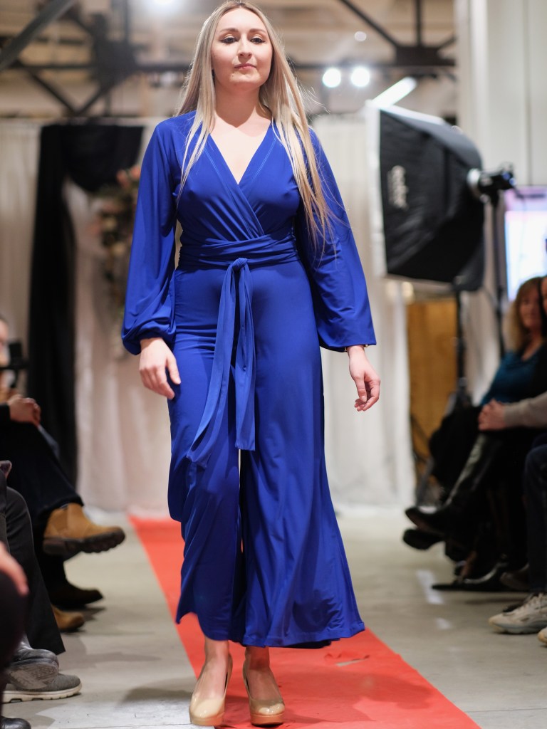 Léonie L’Heureux Coulombe, créatrice de la marque Infime, a présenté ce soir-là de remarquables modèles aux jolis motifs floraux très féminins. Modèles pouvant convenir à la femme de taille régulière aussi bien que celle portant une plus petite taille. Et, cette démarche créative est à souligner en regard de la diversité corporelle, bravo !